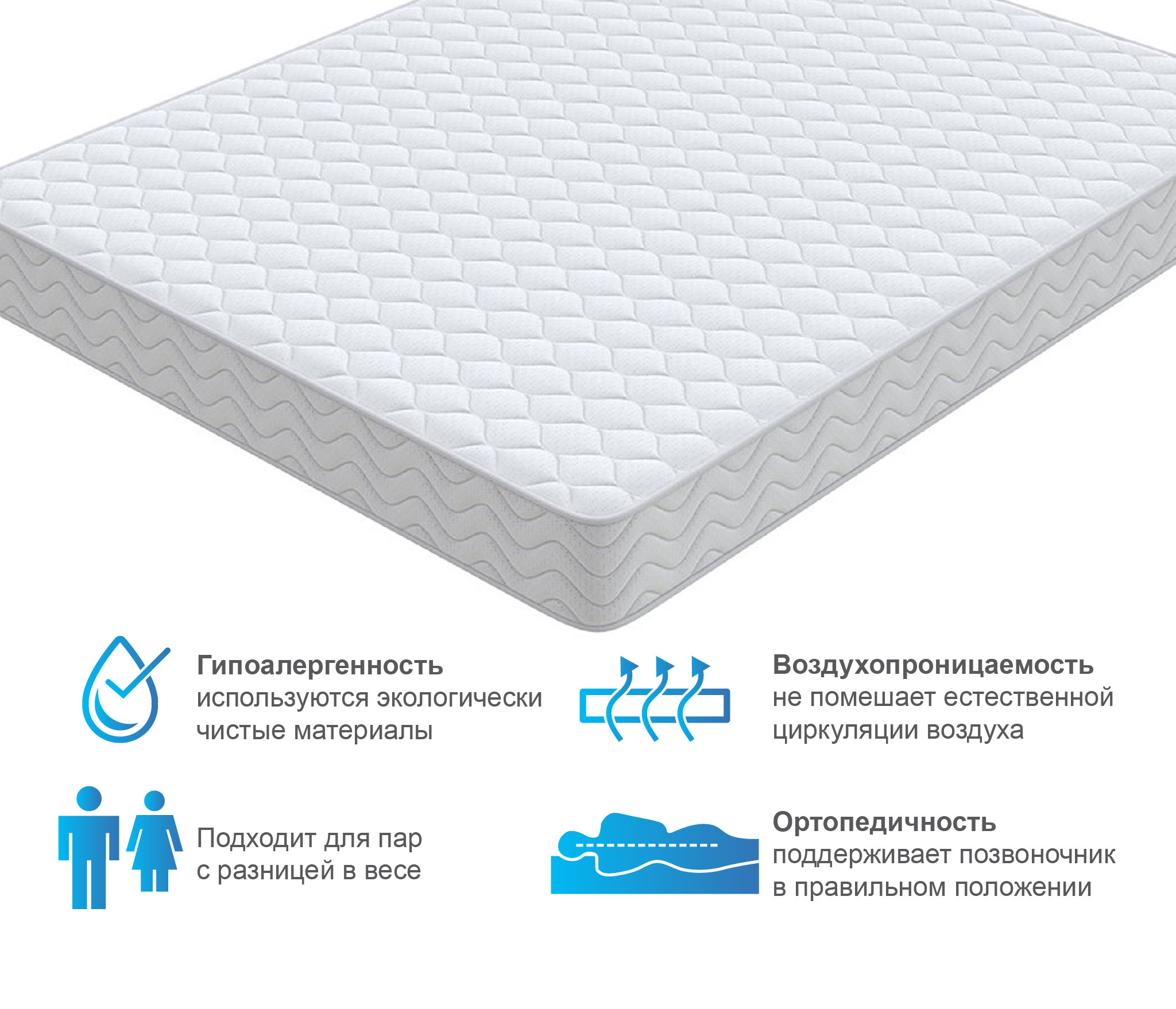 В основе матраса Спринг лежит классический пружинный блок Bonnell, который служит надежной опорой для позвоночника. Наполнитель из эластичного долговечного пенного материала делает матрас комфортным для сна и отдыха. Изолирующий слой из термовойлока придает дополнительную жесткость, а так же за счет своей объемной структуры способствует лучшей циркуляции воздуха.