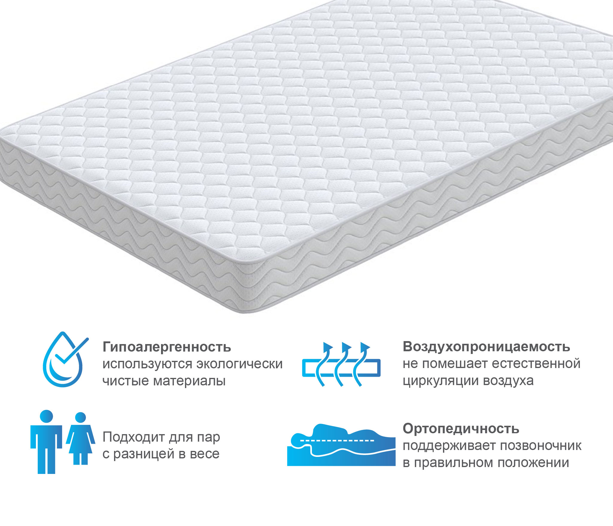 В основе матраса Спринг лежит классический пружинный блок Bonnell, который служит надежной опорой для позвоночника. Наполнитель из эластичного долговечного пенного материала делает матрас комфортным для сна и отдыха. Изолирующий слой из термовойлока придает дополнительную жесткость, а так же за счет своей объемной структуры способствует лучшей циркуляции воздуха.